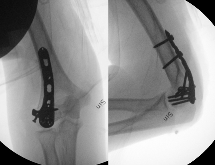 The fractured lateral condyle was mobilized together with the attached ligaments and extensor muscles. The intraarticular fragments were reduced and temporarily fixed with K-wires. Because the coronal shear fragments were thick, fixation from posterior was decided in order not to disturb the articular surfaces. A posterolateral plate with a lateral flange was therefore used.